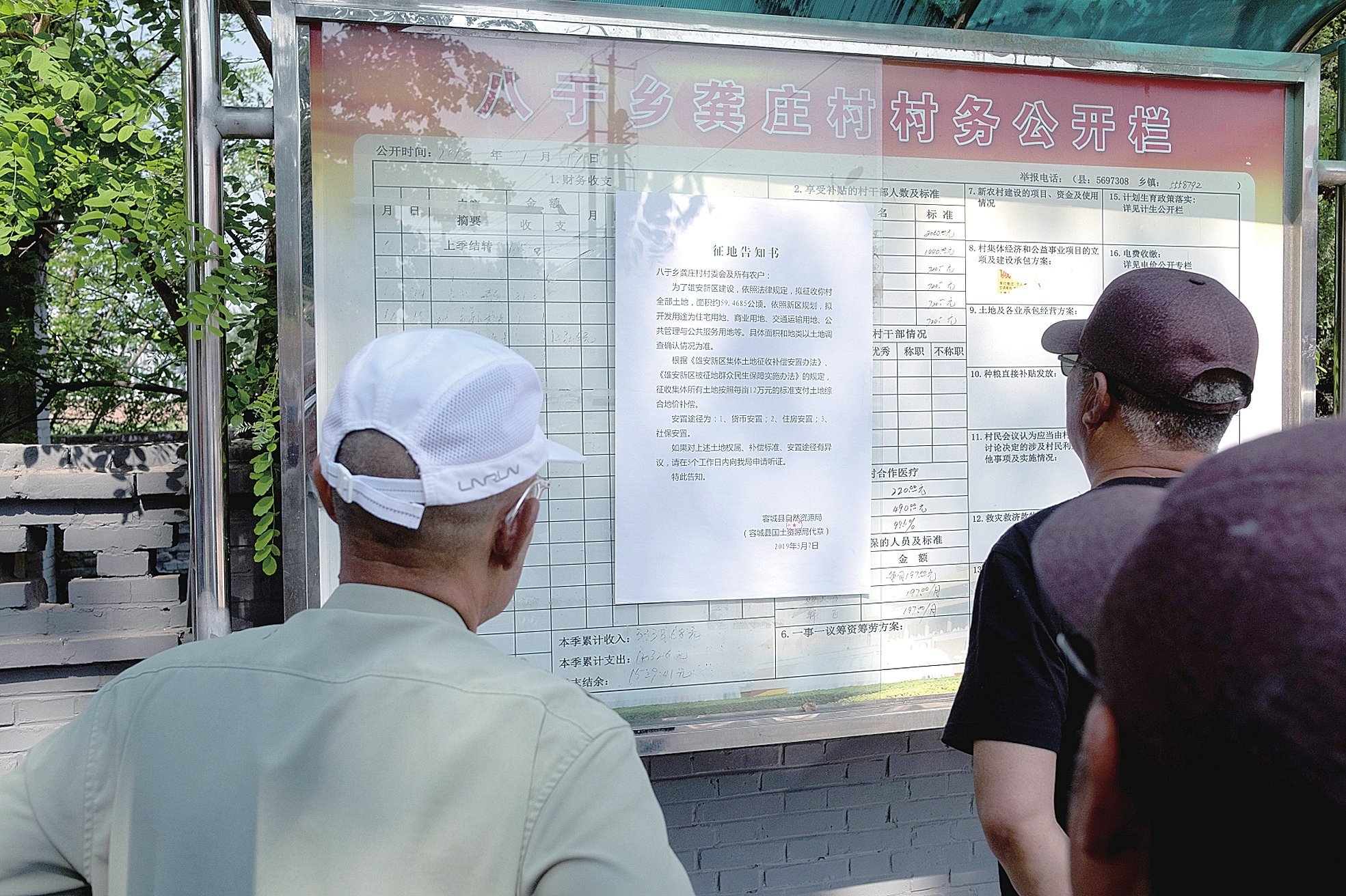▲2019年5月9日,河北雄安新区容城县八于乡龚庄村村委会广场前的公示栏上张贴着征地告知书 视觉中国图